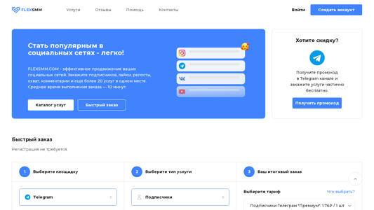 | AI-анализ | The portal FLEXSMM offers social media promotion services including increasing likes, followers, and views on Instagram, Telegram, VKontakte, TikTok, YouTube, Facebook, OK, Rutube, Twitch, X - Twitter, and Discord. Users can choose their preferred platform and type of service such as gaining followers, reactions, shares, comments, auto-views, and bot launches. The minimum order is from 100 to 10,000, and prices vary depending on the chosen service and platform. The website does not require registration and offers a Telegram channel for new promotional codes. |