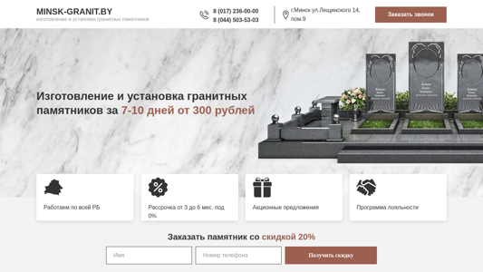 | AI-анализ | --- This website is about the production and installation of granite memorials in Minsk, Belarus, located at ul. Leщинского 14, apartment 9. The contact information includes two phone numbers: (017) 236-00-00 and (044) 503-53-03. The website offers granite memorials with various models, sizes, and prices. Customers can order a memorial with a discount of 20%, and financing options with a repayment period of 3 to 6 months with 0% interest are available. The website also mentions a loyalty program and special offers. The production and installation process takes 7-10 days, starting from 300 rubles. The website includes a catalog with several model categories, such as Econom, Premium, and memorials for two people. |