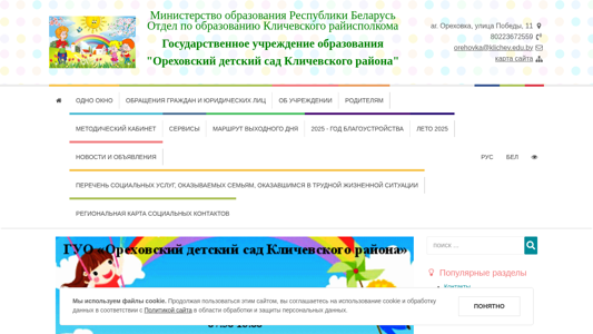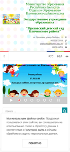| AI-анализ | The website is a government educational institution, "Orekhovsky Detsky Sad Klichevskogo Raiona" (Orekhovka Kindergarten in Klichevsky District), with the address given as Ag. Orekhovka, Ulitsa Pobedy, 11. The website uses cookies and visitors agree to their use upon continued use of the site. The ministry of education in the Republic of Belarus oversees the kindergarten. The site includes sections for administrative procedures, contact information, and various forms for parents and guardians. The kindergarten's working hours, as well as the hours for meetings with management, are listed. There are also sections for emergency situations, vaccinations, and school meals. The site also includes a teacher's page and recommendations for preventing the flu. Additionally, there are sections for school events, a methodological cabinet, and information on social |