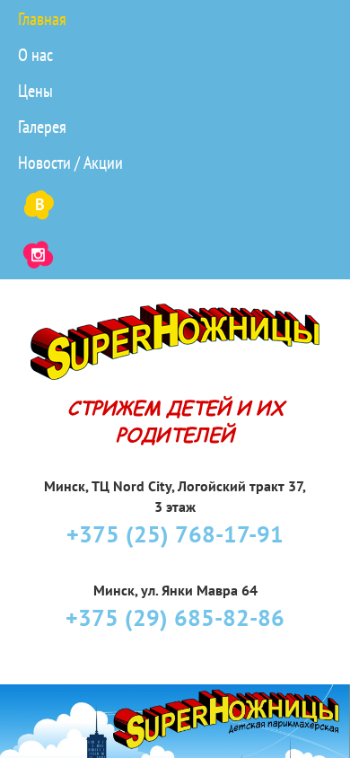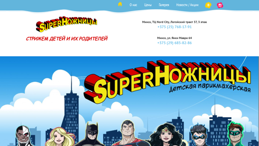 | AI-анализ | This online resource, titled "SuperНожницы" (Super Scissors), is a children's parlor for haircuts. The main page introduces the business with the tagline "Пострижем и поиграем" (We'll Cut and Play). Keywords indicate that the website is about a children's hair salon located in Minsk, Belarus, specifically at Nord City shopping mall on Logoysky Trakt 37 and at Yanush Mavra 64 street. The website offers a comfortable environment for children, with televisions instead of mirrors, personalized attention from stylists, and various toys and activities to make the experience enjoyable. The business aims to make children's first haircut a memorable event and ensures that the process is as comfortable and fun as possible for them. The website includes a gallery, news, and pricing information |