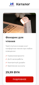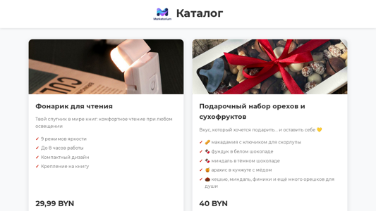 | AI-анализ | The portal Marketorium is a catalog for reading lamps with a tagline "Your companion in the world of books: comfortable reading at any lighting conditions." The website offers 9 different lighting modes and compact design, with a price of 29.99 BYN. A gift set of nuts and dried fruits is available for an additional 40 BYN. Marketorium is a private Belarusian company, with the Unified State Register of Legal Entities (UNP) number 193895981, located in Minsk at the address Pereulok Zagorodny 3-y, dom 4V, office 14. The website includes sections for privacy policy, user agreement, conditions of guarantee and return, and public offer. |