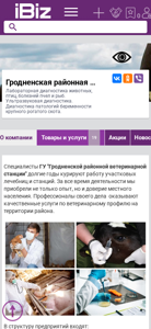 | AI-анализ | This online resource is a veterinary station and laboratory in Grodno, Belarus, located at Славинского, 25. The website provides information on veterinary services, including laboratory diagnosis for animals, birds, bees, and fish. It offers ultrasound diagnosis and diagnosis of pregnancy issues in large cattle. The station also includes a veterinary laboratory and a veterinary-sanitary expertise laboratory in Skiidel. The website states that the specialists have been serving the local community for long years and offer high-quality veterinary services. They provide services for the prevention and treatment of animal diseases using modern equipment and effective medications. The station's services include laboratory diagnosis of diseases in farm animals and poultry, ultrasound diagnosis of cattle's pregnancy and uterus conditions, protection of the region from the spread of infectious diseases, and consultation services. The website also mentions that they are open for |