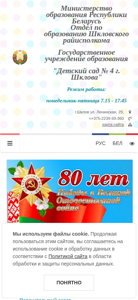 | AI-анализ | --- The website is for the State Educational Institution "Detsky Sad No. 4" in Shklov, Belarus, run by the Shklov Regional Executive Committee's Department of Education under the Ministry of Education of the Republic of Belarus. It provides information on the kindergarten's schedule, administration, contact details, and various administrative procedures. The website uses cookies and requires consent for data processing according to its privacy policy. The kindergarten's operating hours are Monday to Friday, 7:15 a.m. to 5:45 p.m. The site includes sections for popular inquiries, important documents, organizational structure, and a contact page with phone numbers and electronic forms. Additionally, there are sections for the history and achievements of the institution, educational services for a fee, and various multimedia galleries. The site also features information on safety and emergency |