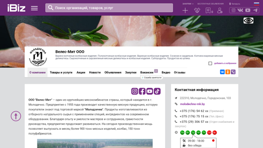 | AI-анализ | This online resource is a Belarusian business website for Veles-Mit OOO, a company based in Mолодечно, Городокская, 103, specializing in the production and sale of various types of processed meat products. The website title includes terms like "варено-копченые колбасные изделия" (cooked and smoked meat products), "колбасные изделия" (sausages and sausages), "субпродукты" (sub-products), and "продуктов из шпика" (pork products). The description mentions a variety of meat-based delicacies, including "копчено-вареные мясные деликатесы" (smoked and cooked meat delicacies), "сырокопченые и сы |