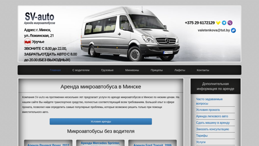 AI-анализ | The web project SV-AUTO is a Minsk, Belarus-based company that offers minibus rental services with both a driver and without, at guaranteed low prices. The website provides a selection of minibuses that meet all requirements, with a large experience in the rental industry enabling the company to identify common problems that can only be solved with a spacious vehicle. Customers can rent vehicles such as Peugeot Boxer, Mercedes Sprinter, Ford Transit, Volkswagen Multivan, and Volkswagen Caravelle, with prices varying based on rental duration and seating capacity. The minimum daily rental price ranges from 70 to 85 rubles, with an additional fee of 100 km over the 500 km limit. The company's contact information, including a phone number and email address, is provided on the website for customers to make reservations. |