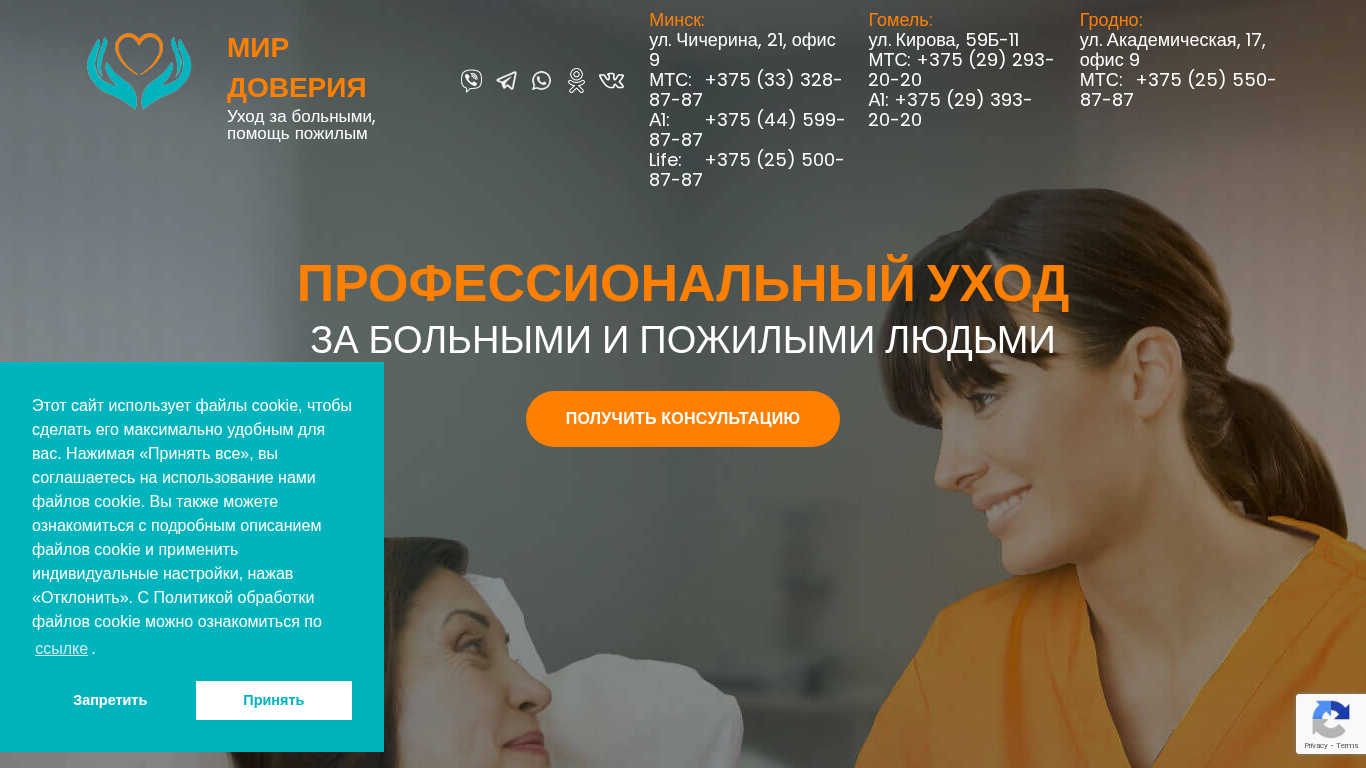 | SEO-описание | Компания "Мир Доверия" в Минске, Гомеле и Гродно осуществляет профессиональный уход за больными, а также оказывает помощь пожилым людям. |