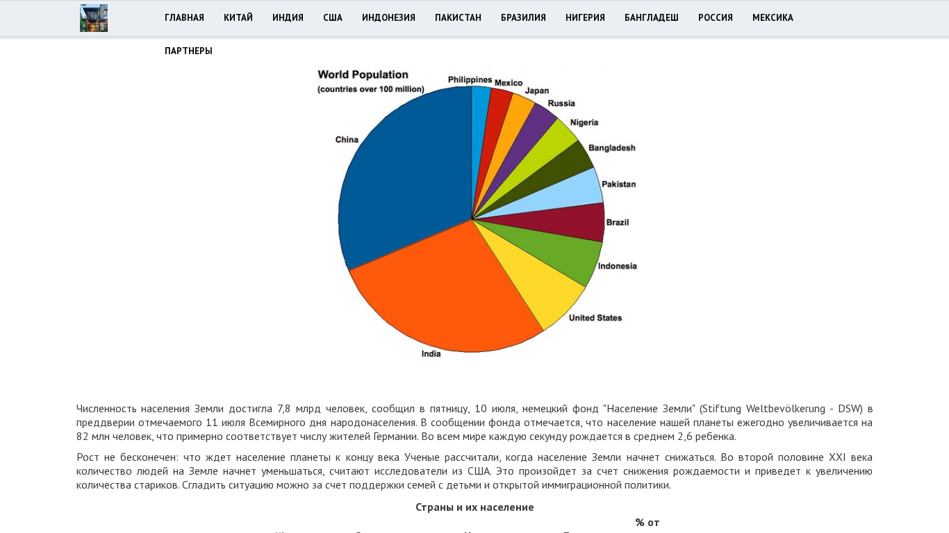 | AI-анализ | --- The portal census.by provides information on population censuses in various countries. Key topics include current population numbers, countries with the largest populations, and population growth trends. The website covers China, India, the United States, Indonesia, Pakistan, Brazil, Nigeria, Bangladesh, Russia, and Mexico. Users can find data on population size, percentage of global population, and dates for each census. The portal also offers free consultation and a section for partners. According to the latest data, the world population reached 7.8 billion people in July 2019, with an annual growth of approximately 82 million people or 2.6 births per second. Experts predict that population growth will begin to decline in the second half of the 21st century due to decreasing birth rates, leading to an aging population. To mitigate this trend, supporting families with children and an open immigration policy are suggested solutions. |