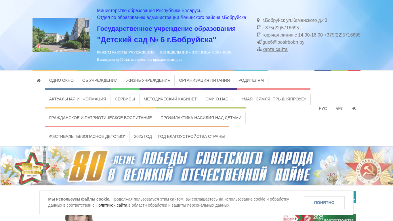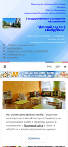 | AI-анализ | This website is for the Kindergarten No. 6 in Bobruysk, managed by the Ministry of Education of the Republic of Belarus, and located in the Leninsky district of the city. The website provides information about the kindergarten's schedule, leadership, phone numbers, and various administrative procedures. Users can find details on the kindergarten's policies, normative documents, and contact information for higher-level organizations. The site includes a map, an electronic application form, and a guestbook. The kindergarten operates from Monday to Friday, 6:30 AM to 6:30 PM, with weekends and holidays off. The phone number for inquiries is provided, along with a hotline from 2 PM to 4 PM. The site offers a structure of the kindergarten, information on its history, and various multimedia galleries. The kindergarten' |