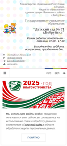 | AI-анализ | The web project "Детский сад № 71 г. Бобруйска" (Childcare Center No. 71 in Bobruisk) is a state educational institution under the Ministry of Education of the Republic of Belarus, located in the Lenin district of Bobruisk city. The website provides information on the opening hours, which are Monday to Friday from 7:00 AM to 5:30 PM, with weekends and holidays being closed. The contact details include the phone number +375(225)432571 and the email address guo71@ooalrbobrr.by. The site includes sections for normative legal documents, contact information, popular inquiries, and a helpdesk. It also features a map, a hotline for administrative procedures, a telephone directory, and a section for disabled individuals. The site |