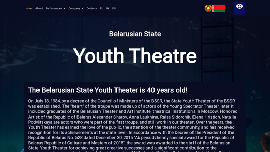 | AI-анализ | type: website language: bg (Belarusian) country_code: BY categories: ["theater", "belarusian"] The Belarusian State Youth Theater is a Belarusian theater company that was established in 1984 by a decree of the Council of Ministers of the Belarusian Soviet Socialist Republic. The company's origins can be traced back to the Young Spectator Theater and graduates of the Belarusian Theater and Art Institute, as well as other theatrical institutions in Moscow. Notable actors associated with the theater include Honored Artist of the Republic of Belarus Alexander Sharov, Anna Laukhina, and Raisa Sidorchik. The website, bgmteatr.by, provides information about the theater's history, performances, and contact details. It is written in the Belarusian language and |