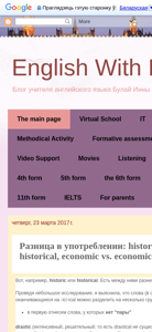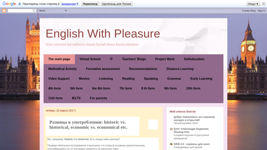 | AI-анализ | The portal English With Pleasure is a blog by Inna Bulay, a teacher of English language. The main page includes sections for Virtual School, IT Teachers' Blogs, Project Work, Selfeducation, Methodical Activity, Formative assessment, Recommendations, Distance Learning, Video Support, Movies, Listening, Reading, Speaking, Grammar, Early Learning, and class specific pages for 4th to 11th forms, as well as a section for parents. The blog post discusses the difference between words such as historic and historical, economic and economical, and provides explanations for the irregularities in English language usage. Inna Bulay uses research to identify groups of words, such as historic and historical, which are often confused due to their similar spelling. She explains that these words have different meanings and provides examples to illustrate their usage. The blog aims to help users |