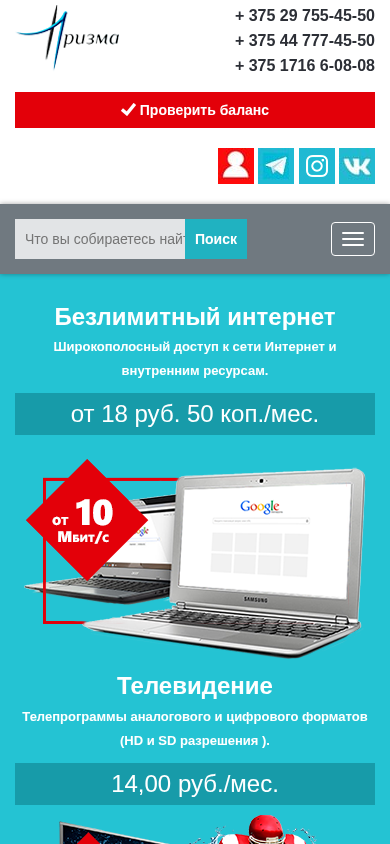 | AI-анализ | This website, titled "Prizma.by," focuses on providing internet and television services. Keywords associated with the site include "телевидение" (television), "компании" (companies), "2025," "проверить" (check), "интернет," "iptv," "августа" (August), "связи," "375," "баланс," "тарифы," "информация," "новости," "сети," "руб" (ruble), "мес" (month), "услуг" (services), and "услуги" (services). The site offers users the ability to check their balance, browse internet tariffs, access a personal cabinet, test internet speed, and view television programming and tariffs. Additionally, the site provides information on |