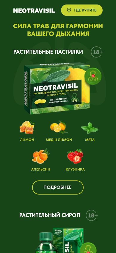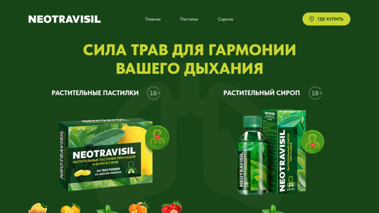 | AI-анализ | The portal Neotravisil is a health and wellness website offering plant-based pastilles and syrups. The homepage features sections on various products, including 'Pastilki' and 'Siropy', with detailed information available by clicking 'Подробнее'. The website emphasizes the multi-functional properties of its offerings, listing five actions of plant extracts in Neotravisil, such as soothing and anti-inflammatory effects. The economic value proposition is highlighted, with one pack of pastilles providing a six-day supply and one bottle of syrup offering a five-day supply. The website notes that the components work for all types of coughs, whether dry or productive, and are gentle on the respiratory system. The website provides contact information for Sunpharma, the manufacturer, and lists registration information from the Belarusian government. |