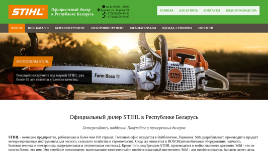 | AI-анализ | This online resource is the official dealer website for STIHL in Belarus. The company, headquartered in Waiblingen, Germany, operates in over 160 countries. Stihl specializes in manufacturing, selling, and distributing motorized tools for forestry, agriculture, and construction industries. The product range includes gasoline-powered lawn mowers, hedge trimmers, chainsaws, leaf blowers, and various accessories. The website also offers Bosch electrical tools for professional use. The official dealer in Belarus has showroom hours from Monday to Friday, 9:00 AM to 6:00 PM, located at Krupki, ul. Kiрова 7/1, with phone numbers +375(33)300-45-33 and +375(44)559-39-07 |