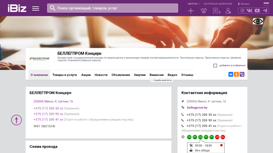 | Название / Заголовок | БЕЛЛЕГПРОМ Концерн - Белорусский государственный концерн по производству и реализации товаров легкой промышленности. Текстильная отрасль. Трикотажная отрасль. Швейная отрасль. Кожевенно-обувная отрасль. . 220004, Минск, , К. Цеткин, 16 |