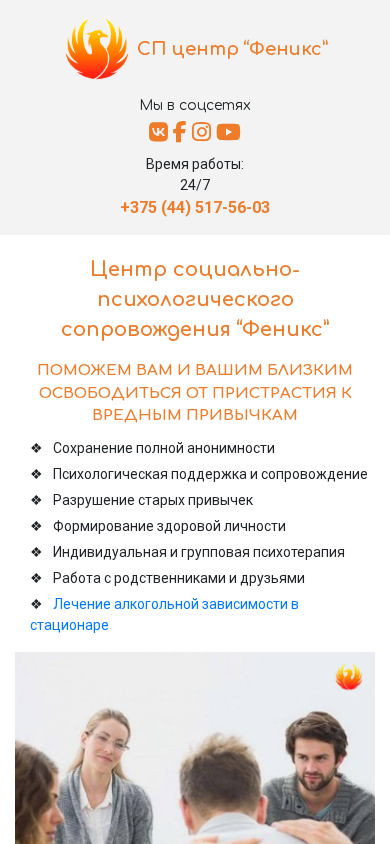 | AI-анализ | This online resource is a social-psychological support center named "Феникс" [Phoenix] for people seeking help with harmful habits. The website offers specialized, authoritative therapy for those suffering from bad habits at this center. Seasonal special offers are available. Contact +375 (44) 517-56-03 for more information. The Phoenix Social-Psychological Support Center assists individuals and their families in overcoming addiction. It provides psychological support and guidance in breaking old habits and forming a healthy lifestyle. Individual and group psychotherapy sessions are offered, along with treatment for alcohol addiction in a facility. This center understands that loved ones have tried various methods to help but have seen their efforts fail. The center aims to support those who wish to change their lives, ending the cycle of destructive habits and returning to a full life. The center's social-psych |