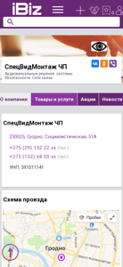 | AI-анализ | This website is for the Belarusian company СпецВидМонтаж ЧП, offering audio-visual solutions, security systems, and networking services. The company's address is given as 230025, Grodno, Socially Orphaned, 51A. Contact information includes two phone numbers: +375 (29) 152 22 xx and +375 (152) 68 00 xx. The company's UNP number is 591011141. The website provides a map scheme for reaching the location and business hours from Monday to Saturday, 9:00 AM to 6:00 PM, without lunch breaks. The company operates in the categories of security systems and is also listed in the Gродно region. |