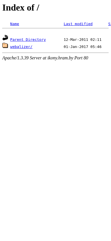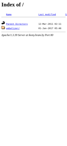 | AI-анализ | The web project "Index of /" is a directory listing of the website located at ikony.hram.by. The listing shows the contents of the root directory, including subdirectories and files. The last modification dates and file sizes are provided, as well as short descriptions for some files. The directory includes a subdirectory named "webalizer" and a file named "Apache" within the root directory, both last modified on different dates. The server running the website is identified as Apache 1.3.39 and the website is accessible via port 80. |