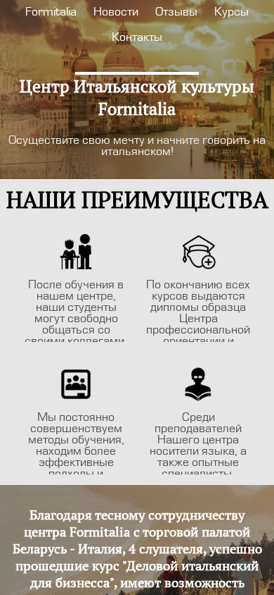 | AI-анализ | --- This online resource is titled "Центр профессиональной ориентации и Итальянской культуры 'Formitalia'" and is associated with the domain 'formitalia.by'. The website offers Italian language courses with a strong focus on professional orientation and Italian culture. Keywords include 'formitalia', 'курсы', 'языка', 'центр', 'профессиональной', 'ориентации', 'итальянской', 'культуры', 'центра', 'итальянский', 'итальянского', 'подробнее', 'отзывы', and 'контакты'. The website features sections for news, reviews, and courses, as well as contacts and information on the Italian Cultural Centre of Formitalia. According to the website, students can communicate effectively with colleagues, business partners, and Italian friends |