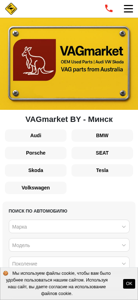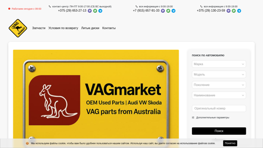 | AI-анализ | The website VAGmarket BY from Minsk, Belarus, offers over 1000 used car parts for sale in Minsk and Belarus. The site provides information on available parts, their availability, and contacts for consultation. Keywords related to the website include 'parts', 'availability', 'BYN', 'consultation', 'benzin', and 'Skoda'. The website sells various parts for brands like Audi, BMW, Porsche, SEAT, Tesla, and Volkswagen. Users can find information on parts such as rims, engine components, and body parts, along with their availability and prices. The website also provides contact information for consultations. Some parts listed include used tires with remaining tread of 6mm and 4.5mm, an original air filter corpus for a Skoda Karoq, a damaged front left fender, a front |