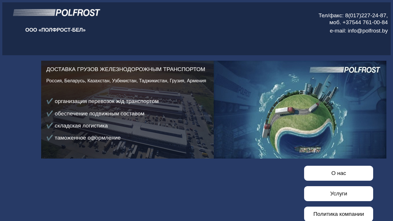 | AI-анализ | --- This website is called POLFROST and offers logistics services for transporting goods using railway transportation. The company provides organization of railway transportation, supply of rolling stock, warehouse logistics, and custom clearance. The contact information includes a phone number (017) 227-24-87, a mobile number (+37544) 761-00-84, and an email address (info@polfrost.by). The company is named OOO «ПОЛФРОСТ-БЕЛ» and serves customers in Russia, Belarus, Kazakhstan, Uzbekistan, Tajikistan, Georgia, and Armenia. |