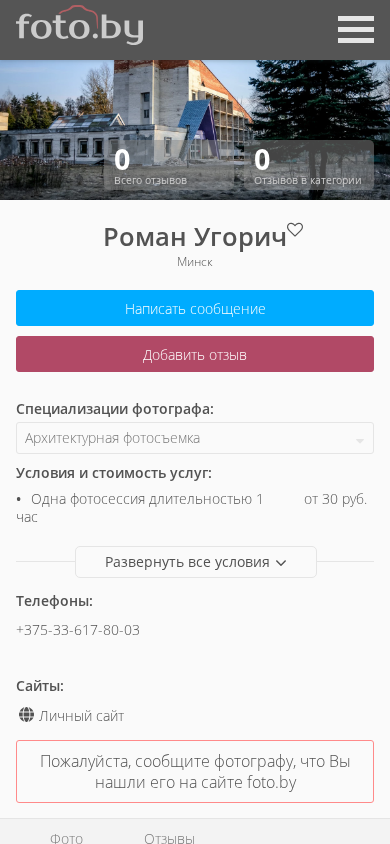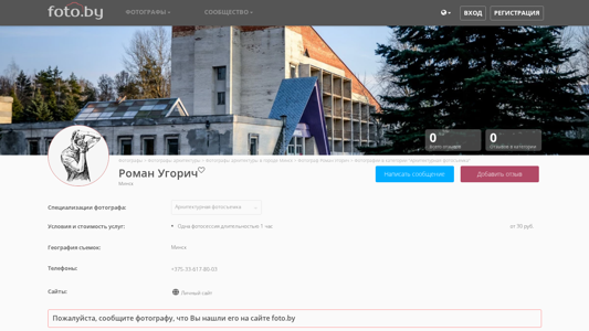 | AI-анализ | The web project "Фотограф Роман Угорич, Минск" is a photography website showcasing the works of Roman Ugorich, a photographer based in Minsk, Belarus. The website primarily focuses on architectural photography, as indicated by the keywords "архитектурная фотосъемка" (architectural photography) and the title "Фотограф Роман Угорич, Минск. Фотографии в катеgorии "Архитектурная фотосъемка"" (Photographer Roman Ugorich, Minsk. Photographs in the category "Architectural photography"). The site is part of a larger community of photographers on the .FOTO.BY domain. Other photography categories on the site include portrait photography, interior photography, and event photography, among others |
