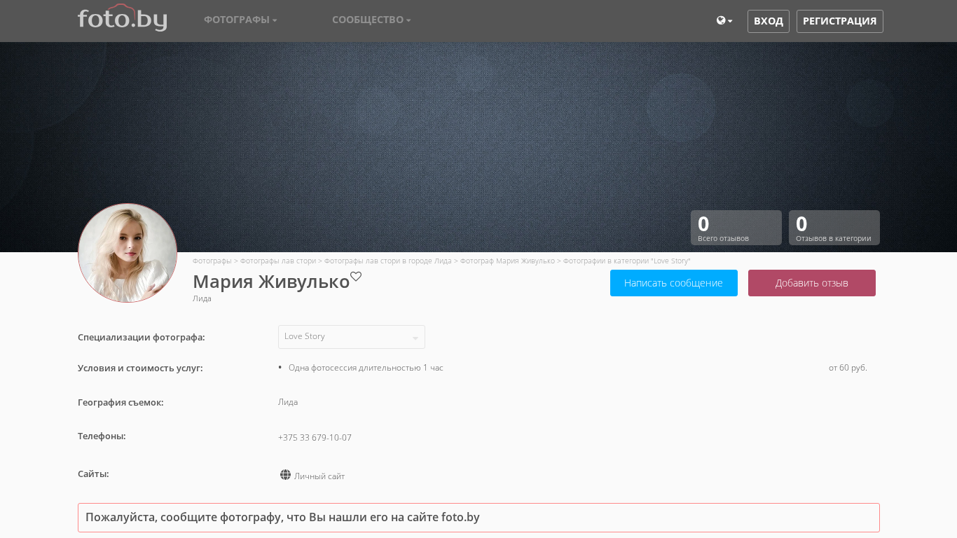 | AI-анализ | The portal is a photography website belonging to Maria Zhivulko, based in the city of Lida, Belarus. The site primarily features photographs in the "Love Story" category. Maria works as a Love Story photographer in Lida. |