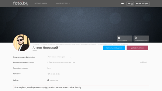 | AI-анализ | --- The portal is a photography website showcasing the works of Anton Yanovsky, a photographer based in Minsk, Belarus. The site primarily features photographs in the category "Photoshoot of Interiors." The website includes a community of photographers and offers various photography services such as those for events, newborns, families, and industrial settings. Visitors can browse through different categories, view individual portfolios, and leave reviews for photographers. The site also provides information on pricing and shooting locations. Anton Yanovsky's portfolio includes 11 photos in the interiors category. The website is available in both Russian and Belarusian languages. |
