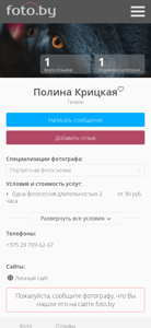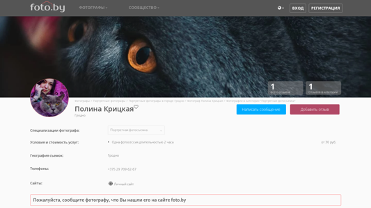 | AI-анализ | url: /portret/polina-kricskaia/ The website is that of photographer Polina Kricskaia from Grodno, Belarus. The main focus of the site is on portrait photography, as indicated by the title and the category label. The photographer offers her services as a portrait photographer in Grodno. Other categories on the site include Love Story photography, child photography, and various other services and genres. The site includes a blog, a community for photographers, and a section for equipment and accessories. The photographer's contact information, including a phone number and personal website, are also provided. |