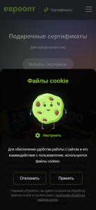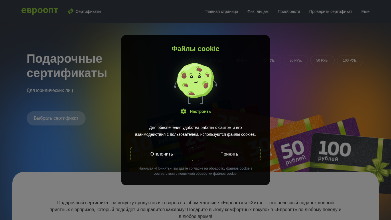 | AI-анализ | This website is an online store for certificates issued by OOO "Eurotorg" for use as payment methods in Euroopt and Hit! retail chains. The title is "Сертификаты" (Certificates) and the description is "Приобрести Проверить сертификат Еще" (Buy Check Certificate More). The top keywords include "сертификат" (certificate), "руб" (ruble), "использовать" (use), "можно" (can), "покупки" (purchases), and "cookie". The homepage is for both physical and legal entities, with options for purchasing certificates, checking their status, and selecting various certificate types and prices. The certificates are valid for three months and can be used in full or split into multiple parts for purchases in Euroopt and Hit! stores. Customers can |
