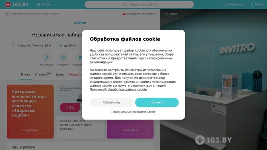 | SEO-описание | Независимая лаборатория ИНВИТРО Орша ул. Ленина 19-8 – телефоны, время работы, отзывы и схема проезда в каталоге медицинского портала 103.by. |