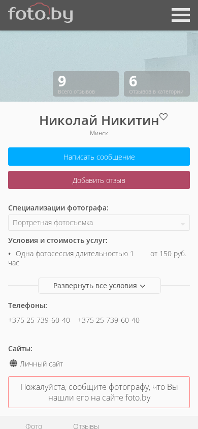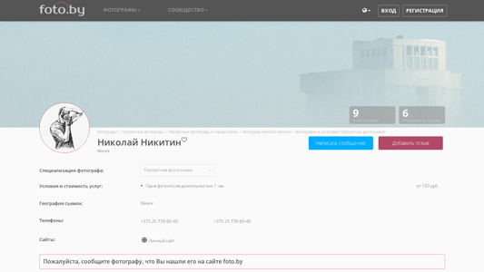 | AI-анализ | The portal is a professional photography website featuring the portfolio of Nikolai Nikitin, a photographer based in Minsk, Belarus. The website offers a range of portrait photography services for various purposes, such as advertising automobiles and real estate for sale. Nikolai Nikitin's photography categories include portraits, interiors, and reclaming. He covers cities like Minsk, Molodechn, Borisov, Bobruisk, Baranovichi, Osiopovichi, Zhodino, Orsha and more. Keywords associated with the website include "фотографии," "фотограф," "миниск," "фотографы," and "портретная." The website also offers a community for photographers, a blog, and statistics. Nikolai Nikitin's personal website can be found on foto. |