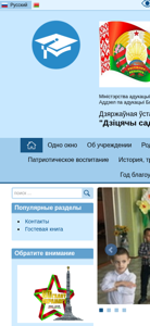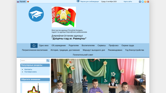 | AI-анализ | ---------------------------------------- The web project "Дзіцячы сад аг. Равяцічы" (Children's Garden of Rewyatichi) is a Belarusian educational institution website with a focus on childcare and safety. The title indicates that it is a part of the Bierazouska Raion Educational Committee under the Ministry of Education of the Republic of Belarus. The description mentions services for parents, a history section, and popular topics such as child safety and injury prevention. Keywords include 'children', 'garden', 'education', and 'safety'. The most frequent words on the site are 'children', 'read', 'further', 'time', 'adults', 'child', 'near', 'institution', 'life', 'parents', 'travels', and 'education'. The site has a standard color scheme with |