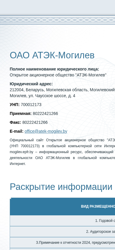 | AI-анализ | This online resource is the informational website for Open Stock Company "ATЭК-Могилев" (UNP 700012173), located in Belarus, Moгилев region, Moгилев, ul. Chaussée de Chaussee, d. 4. The website provides access to the company's annual reports for the years 2023 and 2024, including auditor's reports and notes required by Belarusian legislation. Users can download the reports by providing an email address and password to access the personal cabinet. The website is developed by epfr.by. |