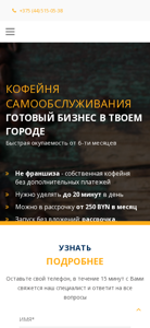 | AI-анализ | This website is for a coffee business offering self-service coffee machines for businesses with a discounted price. The title is "Buy a self-service coffee machine for business with coffee price discount | Vending coffee machine with yourself Coffee Time." The description mentions a phone number and operating hours. The website provides information about the benefits of this business opportunity, such as quick return on investment within 6-8 months, no franchise fees, minimal time investment, and financing options. The website also states that the investment is only 250 BYN per month, with the option to purchase or rent the coffee machines. The website offers modern furniture-like modules, remote control of the self-service coffee machine, 24/7 operation, and high-quality coffee and ingredients. The domain is coffeetime.by. |