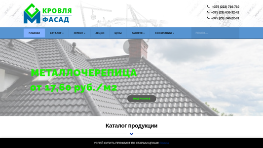 | AI-анализ | --- The web project "Profmetal.by" offers metal roofing and wall panels, as well as related materials and services in Mogilev, Belarus. The company sells metal roofing sheets, gutters, and insulation materials, along with related components such as ventilation systems, safety elements, and decorative facade panels. Services include consultation, measurement, and installation of the offered products. The website provides detailed product information and prices, including metal roofing at 17.60 rubles per square meter, and wall panels at 16.5 rubles per square meter. The company, Mosstroy-plus, specializes in supplying materials for roofing, facade cladding, and fence construction. The website also features a catalog of products, uptime information, and contact details. |