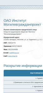 | AI-анализ | This online resource belongs to the Open Joint Stock Company "Institute of Moгилевgrаzhdanпроект". The website provides access to various reports and documents, including annual reports and auditor's conclusions, dating back to 2010. Users can download these files in PDF format. The website also includes a login page for accessing a personal cabinet, where users can register or log in using their email address and password. The homepage displays a message inviting users to enter their email and password to access their personal account. The website was developed by epfr.by. |