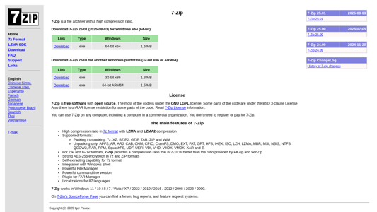 | AI-анализ | The web project 7-Zip is a homepage for the free, open-source file archiver named 7-Zip. It offers downloads for various Windows platforms, including 64-bit and 32-bit versions, and provides information on the software's features and licensing. The main features include high compression ratio, support for various formats, strong AES-256 encryption, self-extracting capability, and integration with Windows Shell and FAR Manager. The software is licensed under the GNU LGPL, BSD 3-clause, and unRAR licenses. The website is available in multiple languages and offers a forum, bug reports, and feature request systems on its SourceForge page. The latest version, 7-Zip 25.01, was released on August 3, 2025. |