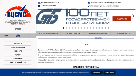 | AI-анализ | The web project "Витебский ЦСМС" (Vitebsky TSMS) is a Belarusian certification and metrology center located in Vitsebsk at ul. B. Khmelynitskogo, 20, 210015. The organization offers various certification services, including construction materials and products, management systems, transport services, and industrial production. The website provides information on testing and certification procedures, forms for requesting calibration services, and development concepts for the state metrology service in Belarus. Additionally, the site includes sections on metrology, electrical and thermal testing, mechanical and liquid testing, and radio technology testing. The contact details are +375 212 48-04-19, Monday to Thursday from 8:00 to 17:00, Friday from 8 |
