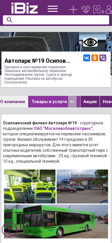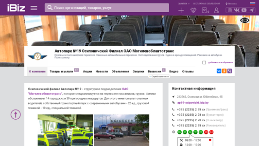 | Название / Заголовок | Автопарк №19 Осиповичский Филиал ОАО Могилевоблавтотранс - Грузовые и пассажирские перевозки. Заказные автомобильные перевозки. Экспедирование грузов. Сдача в аренду помещений. Реклама на автобусах. Гостехосмотр. . 213763, Осиповичи, , Юбилейная, 45 |