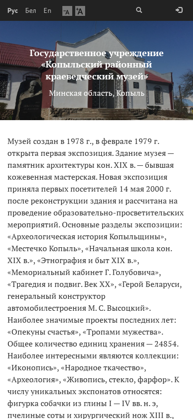 | AI-анализ | The web project "Копыльский районный краеведческий музей" (Kopyl District Regional Museum) is a website dedicated to providing news, event information, and visitor resources for the Kopyl District Regional Museum in Belarus. The museum, which was established in 1978 and opened its first exhibition in 1979, is housed in a historic building from the end of the 19th century, formerly a leather workshop. The new exhibition, reopened in 2000 after renovations, focuses on educational and enlightening activities. The main sections of the exhibition include "Archaeological History of Kopylshchina," "Mestechko Kopyl," "Beginning School of the Late 19th Century," "Ethnography and Life of the 19th Century," "Memorial Cabinet of H. |