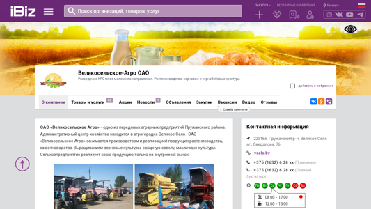 | AI-анализ | The web project "Vselo.ibiz.by" is an agricultural cooperative, "OAO Velikoseльskoe Agro," located in the village of Velikoye Selo in the Pruzhansky district of Belarus. The company specializes in livestock breeding for meat and dairy production and in crop farming, growing cereals and legume crops. The cooperative sells its products exclusively on the domestic market. The main crops produced are milk, meat from KRS livestock, cereals, and oilseeds. The primary focus of the cooperative is to increase production of grain, sugar beets, and rapeseed. Agriculture plays a significant role in the development of the livestock farming for meat and dairy production. The cooperative's main revenue comes from the sale of milk. The company ensures product quality while offering competitive prices. With an |