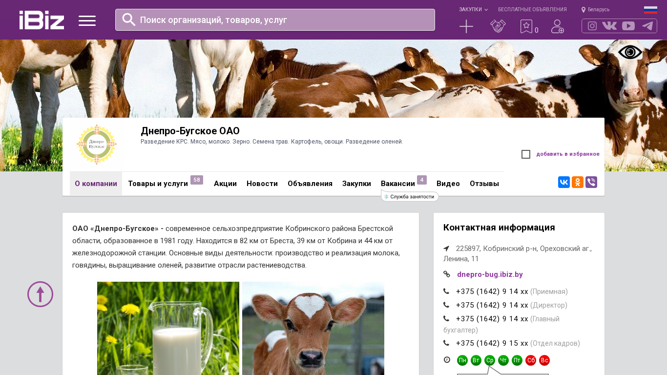 | Название / Заголовок | Днепро-Бугское ОАО - Разведение КРС. Мясо, молоко. Зерно. Семена трав. Картофель, овощи. Разведение оленей.. 225897, , Ореховский аг., Ленина, 11 |
