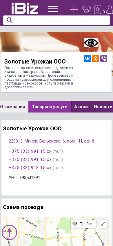 | Название / Заголовок | Золотые Урожаи ООО - Оптовая торговля семенами однолетних и многолетних трав, с/х растений, сидератов и медоносов. Производство и продажа травосмесей для озеленения, пастбища и сенокосов. Услуги очистки и доработки семян.. 220313, Минск, , Бельского, 6, пом. 1H, оф. 8 |