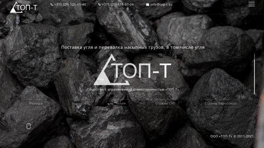 | AI-анализ | This website is for ООО «ТОП-Т», a Belarusian company that offers complex services for the handling and sale of bulk cargo, including coal, in Brest. The company also sells Russian coal brand D in bulk. The website includes contact information for the company's phone numbers and email address, as well as information about the company's services and partnerships. The company has been in business for over 4 years and is located on the border of Belarus and Poland, with its own railway terminal that supports both 1520mm and 1435mm gauge tracks. The company has long-term contracts with major coal producers in Russia and railway transportation companies in Russia and the European Union, allowing it to supply a wide range of high-quality coal with delivery to any location in Europe. The website also mentions the company's 10 years of experience in handling |