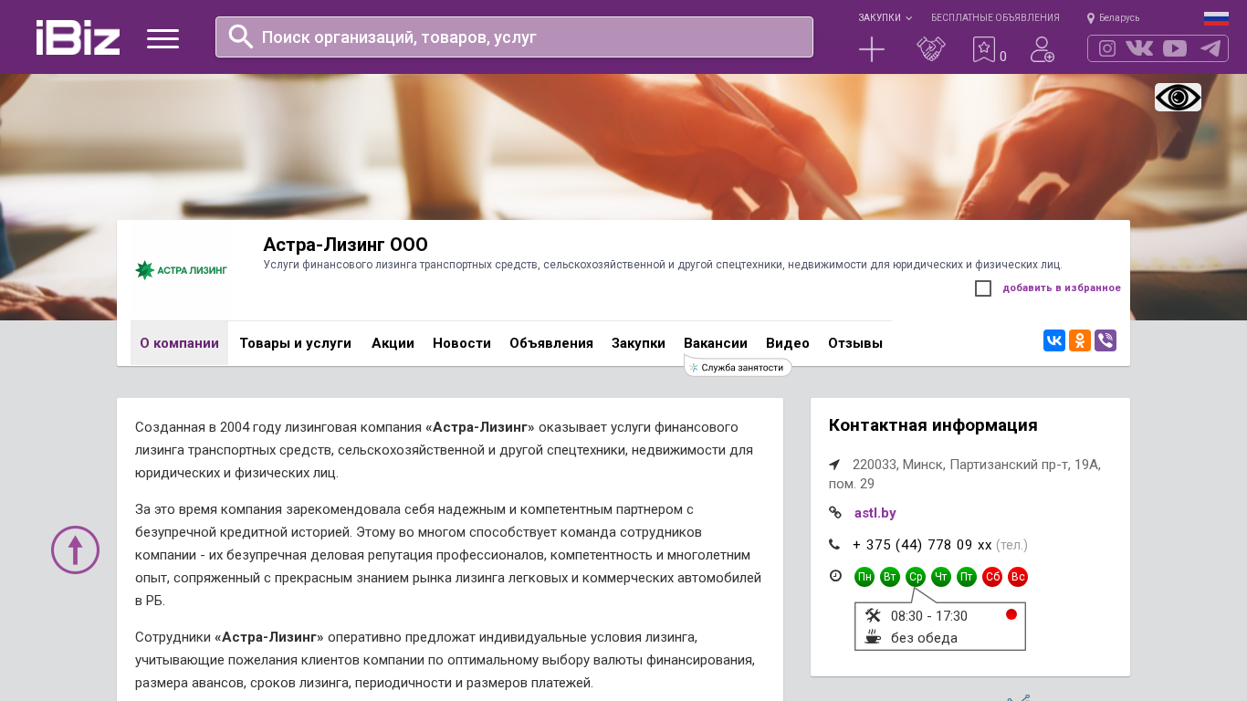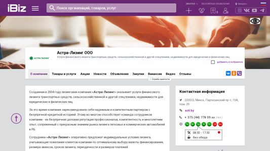 | AI-анализ | The website is a Belarusian business company named "Астра-Лизинг ООО" that offers financial leasing services for transportation vehicles, agricultural machinery, and other specialized equipment, as well as real estate for both legal entities and individuals. The company was founded in 2004 and has established itself as a reliable and competent partner with an unblemished credit history. The team of professionals at "Астра-Лизинг" offers individual leasing terms, considering clients' preferences for financing currency, down payments, leasing terms, payment schedules, and sizes. The contact information provided includes the address at Партизанский пр-т, 19А, пом. 29 in Minsk, Belarus, and the phone number +375 (44) 778 09 xx. The business hours are Monday to Friday from 0 |