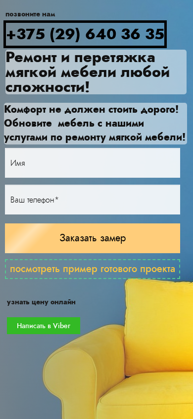 | AI-анализ | The portal obivka-remont.by is a website dedicated to the repair and restoration of soft furniture in Minsk and the Minsk region of Belarus. The company offers a high-quality repair and re-upholstery service with a guarantee on all services. Prices are competitive and the website provides an individual approach for each client, with discounts for pensioners. The website also promises to give new life to old furniture. Keywords related to the website include repair, reupholstery, furniture, prices, Minsk, and restoration. The website includes an online form for users to request a quote, as well as a phone number and Viber contact for users to get in touch. The website promises quick turnaround times and the use of reliable materials, with a maximum savings of money and time for customers. The website also offers a free pick-up service for furniture and provides three years |