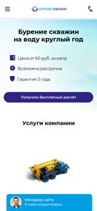 | AI-анализ | --- The website is dedicated to drilling wells in Mogilev, Belarus, at an affordable price with a 0% interest-free installment plan. The service covers drilling for water in the Mogilev region, as well as repair and installation. The company also offers pile driving under the key. Prices and inclusions are available for viewing. Services include drilling, repair, installation, and pumping to visually clean water. A quote can be obtained by leaving a request. Drilling for water is available year-round, with prices starting at 60 rubles per meter. The company offers a discount of 3% for orders of two wells within one settlement. The company provides individual approaches and guaranteed quality. Payments can be made both in cash and non-cash. The company is ready to perform complex drilling tasks in Mogilev and the region. Geoph |
