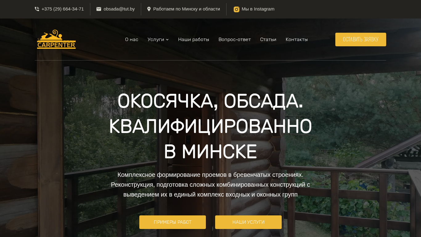| AI-анализ | --- This online resource is dedicated to the siege of Okoсячка in Minsk. The title and description of the website include the keywords 'obsada,' 'окосячка,' and 'минске,' indicating a focus on this specific historical event. The top_words suggest that the website offers services related to the siege, including the preparation of projects in 'срубах' or log cabins, the installation of doors and windows, and the rebuilding of poorly executed projects. The contact information '+375 (29) 664-34-71' and 'obsada@tut.by' are provided, as well as links to the company's Instagram page and a 'Наши работы' or 'Our works' section. The website appears to be based in Minsk and offers comprehensive services for the formation, preparation, and rebuilding of log |