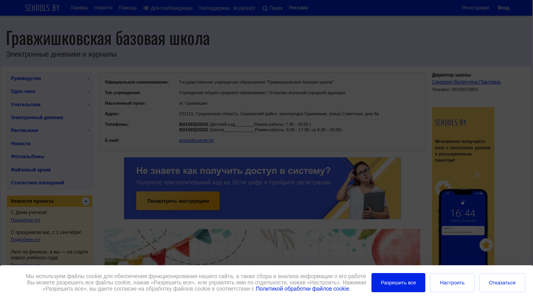| AI-анализ | --- The web project "Гравжишковская базовая школа" (Gravzhishkovskaya Bazovaya Shkola) is a school website with a dark color scheme and disabled images. The title and description of the site are provided in Belarusian, with keywords including 'school', 'work', 'education', 'cookie', 'files', and 'news'. The site utilizes cookies for site functionality and data collection. Users can consent to all cookies or manage them individually. The site is part of the 'Schools.by' domain. |